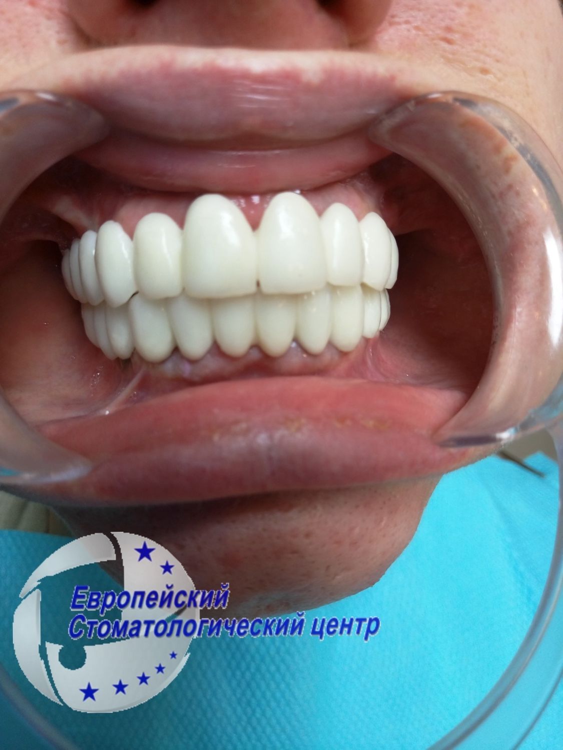 Permanent crowns were entrusted to me by a member of the German Oral Implantologists Association (DGOI), the authorized representative of the Global Academy of Osteointegration (GAO core member) - Denis Romanovich Shilenko. After out-of-mouth parallelometry, preparation was performed over the gingival part of the implants and impressions were taken on the manufacture of permanent crowns on the upper and lower jaws. After 2 weeks, the patient was fixed fixed structures based on the frame of zirconium dioxide (see pic. 5-6).