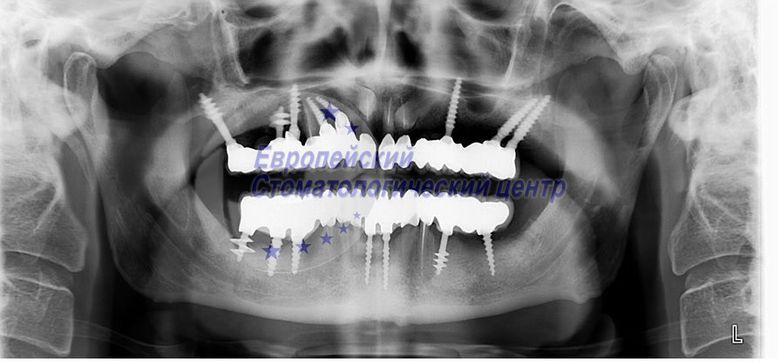Цей клінічний випадок показує перевагу одноетапних і базальних імплантатів які встановлюються малоінвазивним методом без накладення швів і нарощування кістки. В даній клінічній ситуації є складні анатомо-топографічні умови верхньої щелепи. Дефіцит висоти альвеолярного відростка на верхньої щелепи а також дістопірованних (зуб, який не може самостійно прорізатися) ікла. Операція по установці одноетапних імплантатів пройшла без розрізу і без накладення швів. Одне етапні імплантати встановлені з негайною навантаженням. Не було необхідності видаляти непрорезавшійся ікла і тривалий час нарощувати кістку. Постійне протезування вироблено через 4 місяці. Блискучі відстрочені результати через 5 років після операції кажуть про перевагу даного методу.