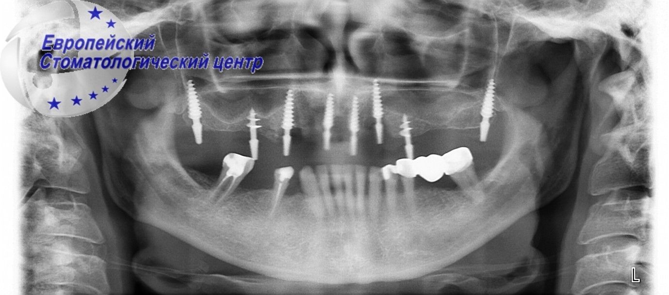 На данный момент пациентка ожидает полной интеграции имплантов и установки постоянной несъемной конструкции. Краткосрочная реабилитация (3 дня) достигнута благодаря многолетнему опыту, постоянному совершенствованию и технике врачей ЕСЦ.