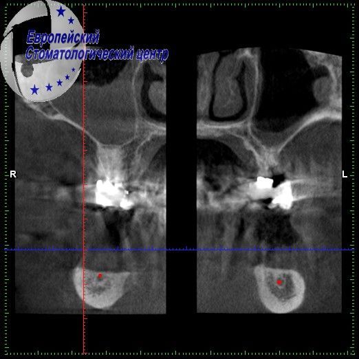 Ранее она установила импланты в другой клинике, но не согласившись с предложенным там планом лечения перед протезированием она обратилась в нашу клинику. Близость нижнечелюстного нерва существенно осложняла клиническую ситуацию для возможной доимплантации (см.Рис. 3). Было установлено дополнительно 4 импланта в обход нижнечелюстного нерва (см.Рис. 4-5).
